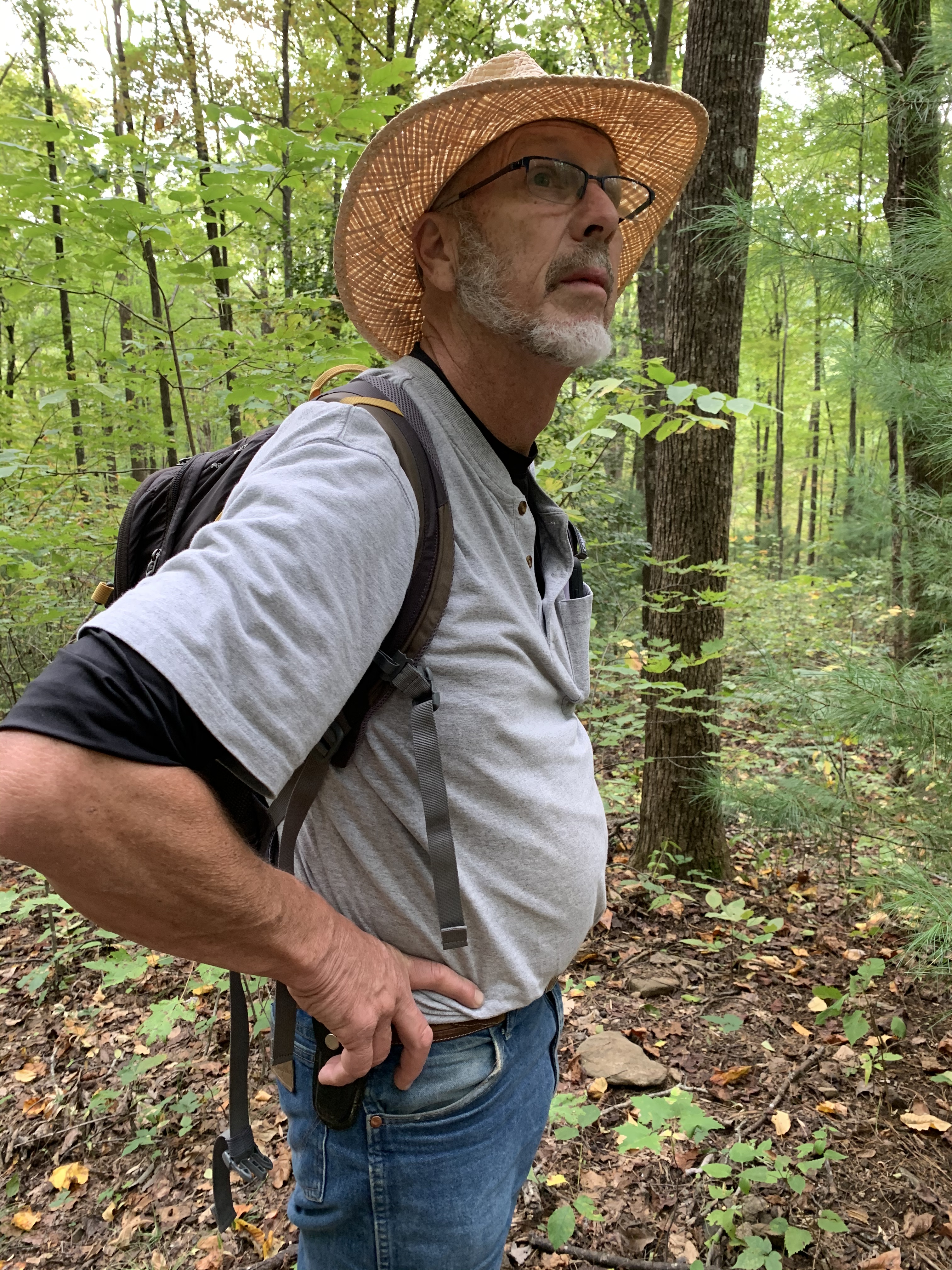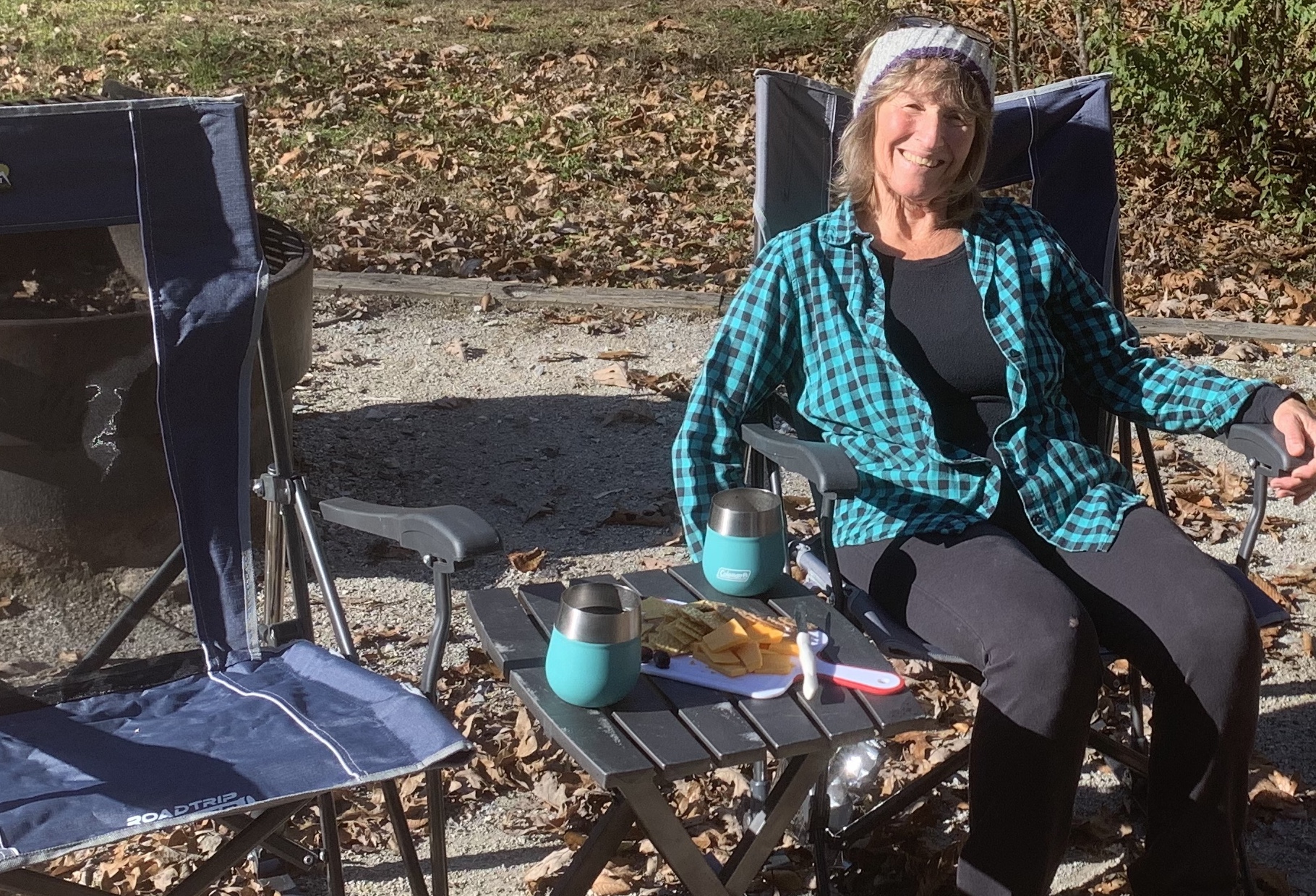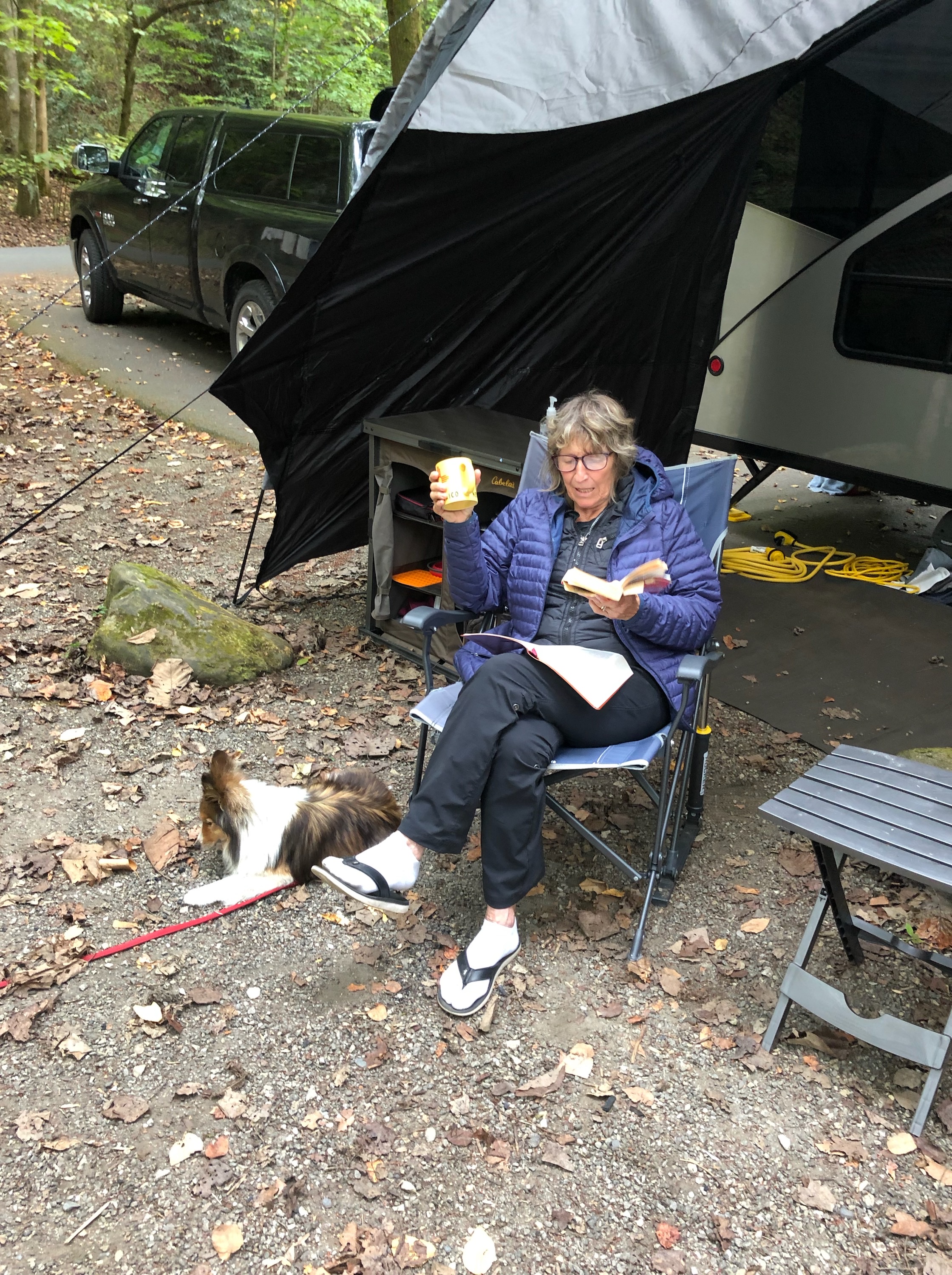 Crisp air, crunching leaves underfoot, a few fall colors still on the trees, the sun creating sparkling diamonds on the water, the calming sound of a gently flowing creekā-ahhh! Nature is so rejuvenating to the soul.The sounds and sparkles of our hike. Can you tell Iām enjoying this beautiful day?Sunny has trekked many miles with us! He is the BEST traveler!Roger says, āI see evidence of bears in these woods!ā š³Always nice to get back to camp, rest our tired feet and EAT!