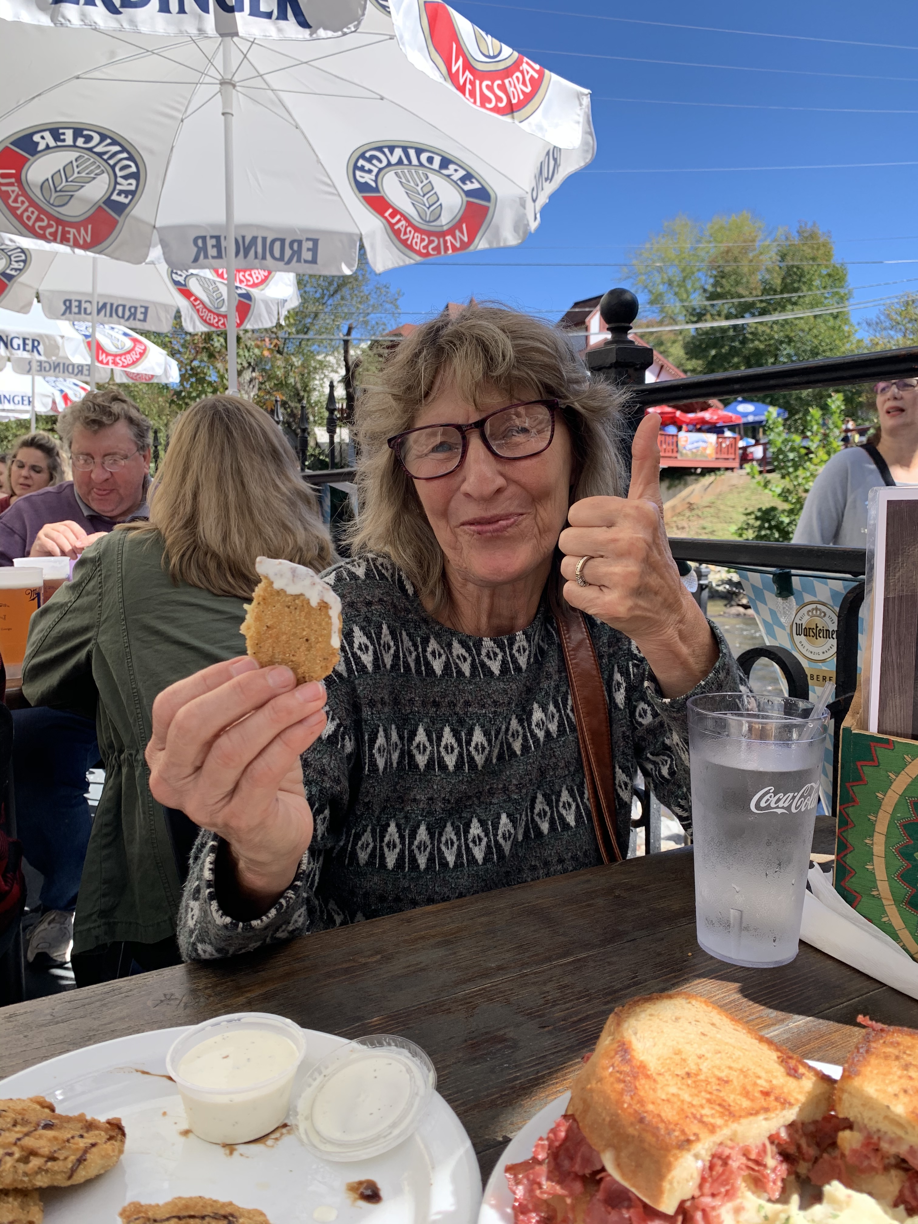 Love adventuring with this guy. (He LOVES adventuring with her -RW)Lunch at the Troll Restaurant with music coming from the other side of the river. Our first time eating FRIED GREEN TOMATOES….. Good like the movie.