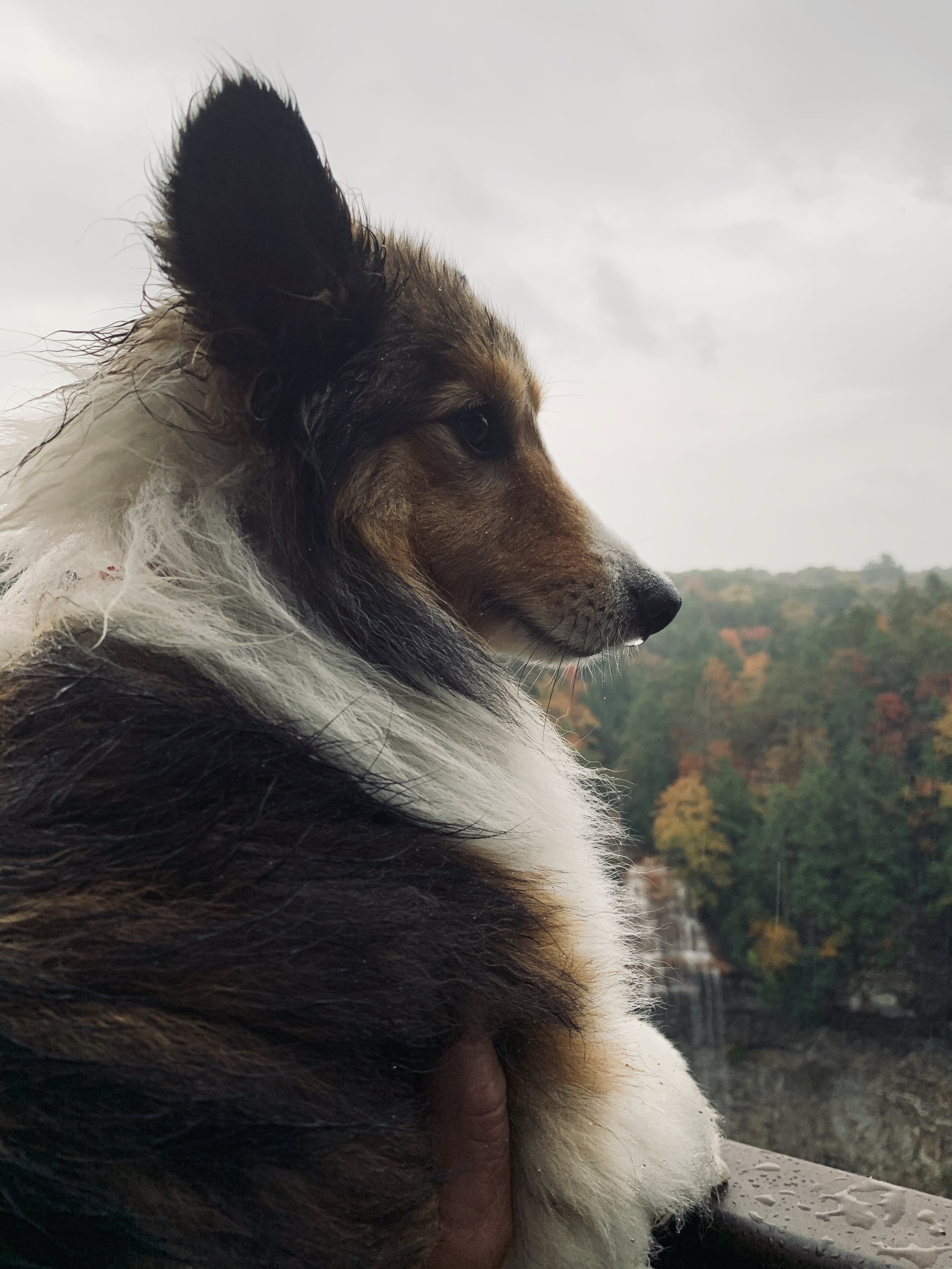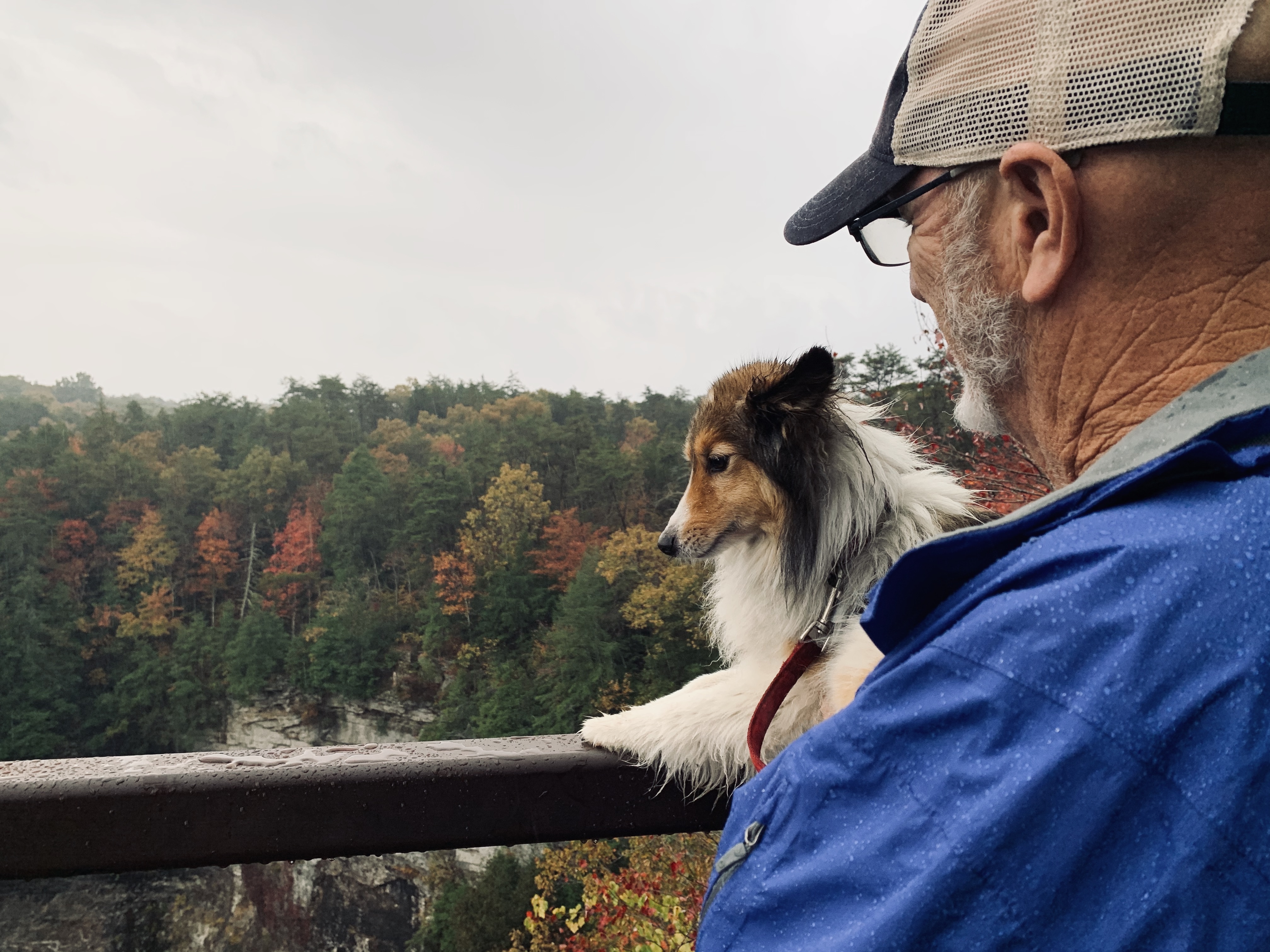 See Lightchaser nestled in among the trees?This amazing stick bug showed up on Rogerās shoulder! We were careful as we deposited her near some fine sticks.Ah, fall! Love it. Canāt get enough of these colors.We took this picture right before the rain started and the clouds came in! We were amazed at the beauty in the mist.Sunny says, āItās raining! What ARE we doing?āāCome on! Letās go home! Canāt you see the rain dripping off my nose?ā