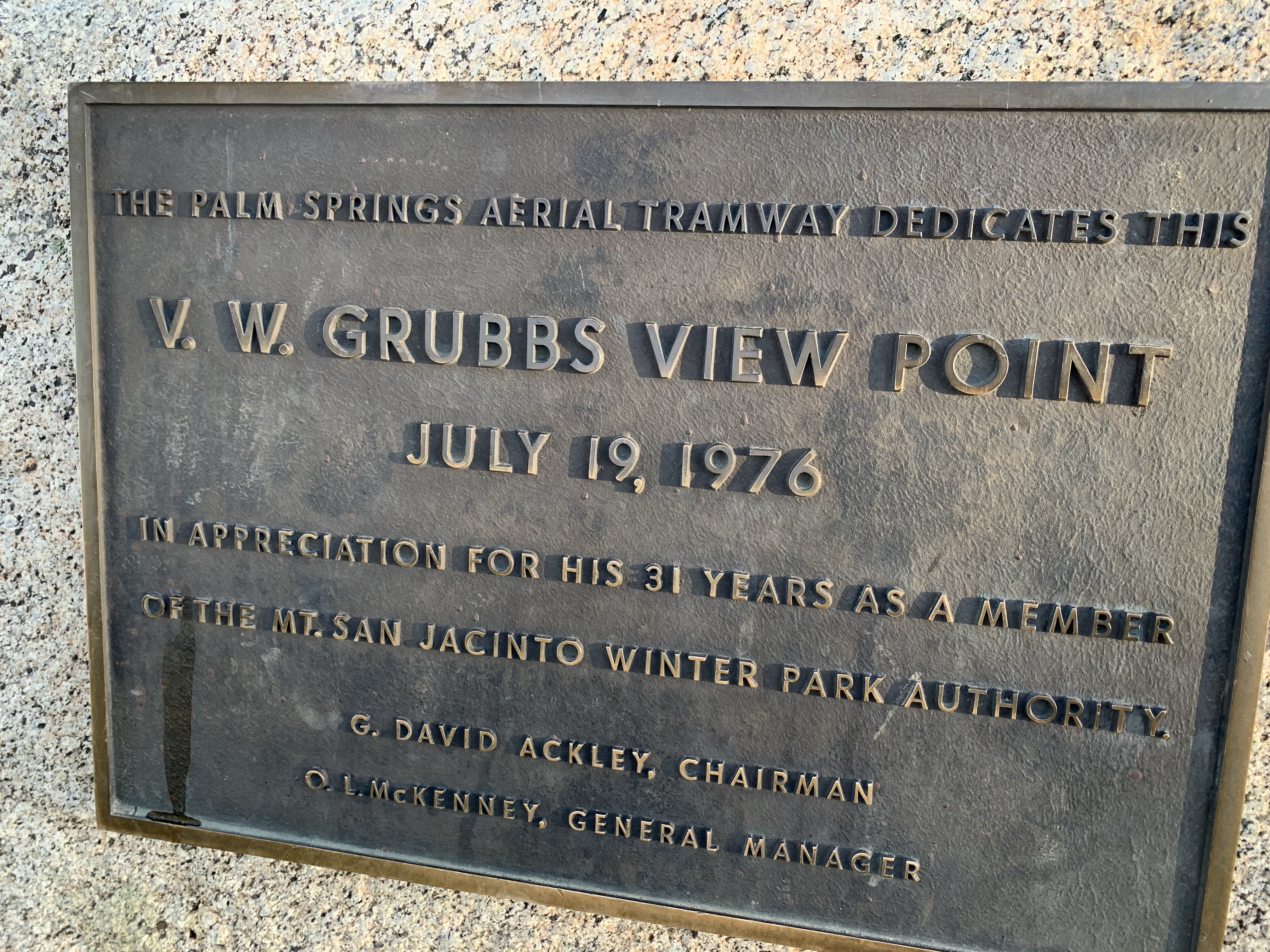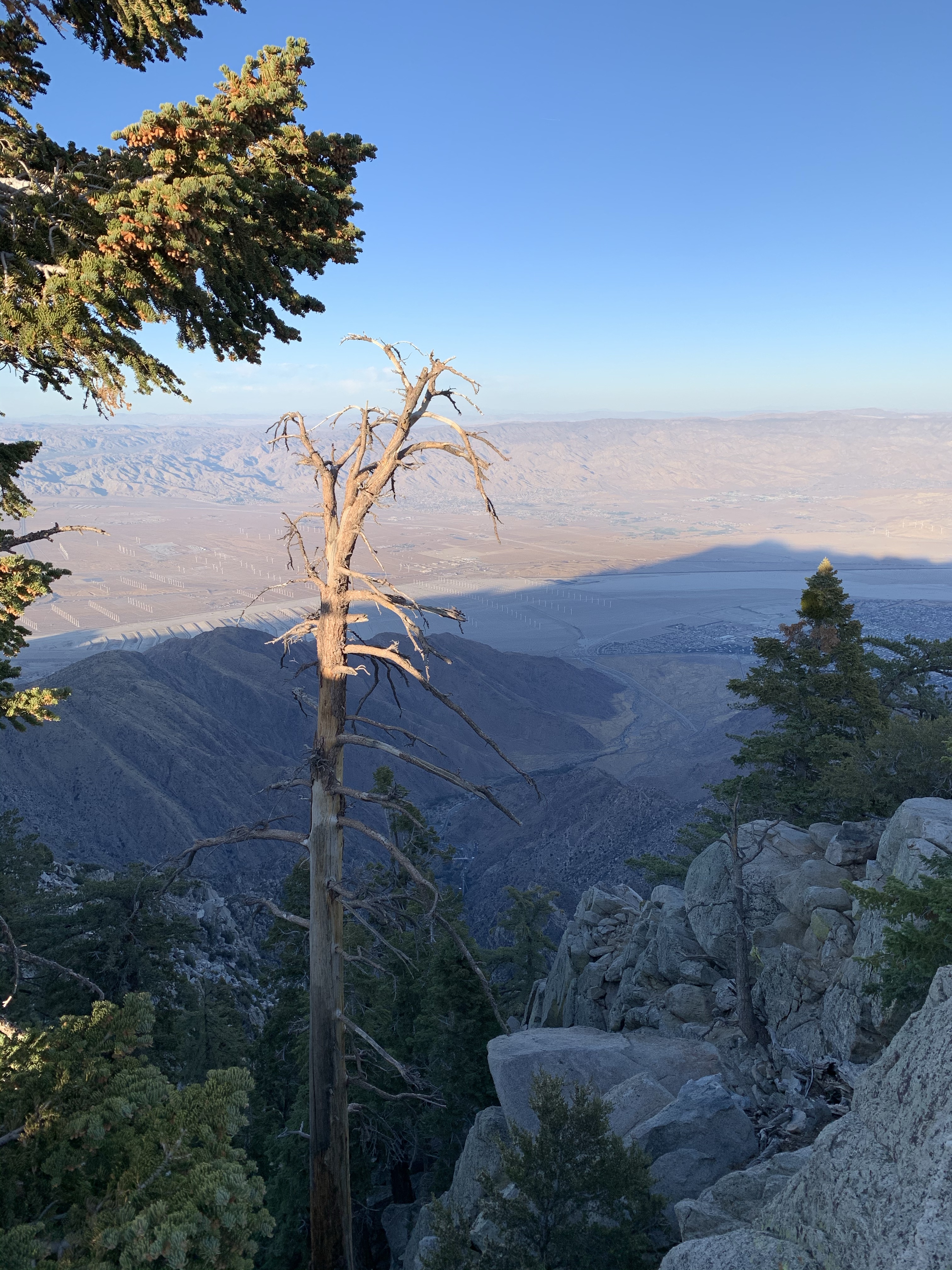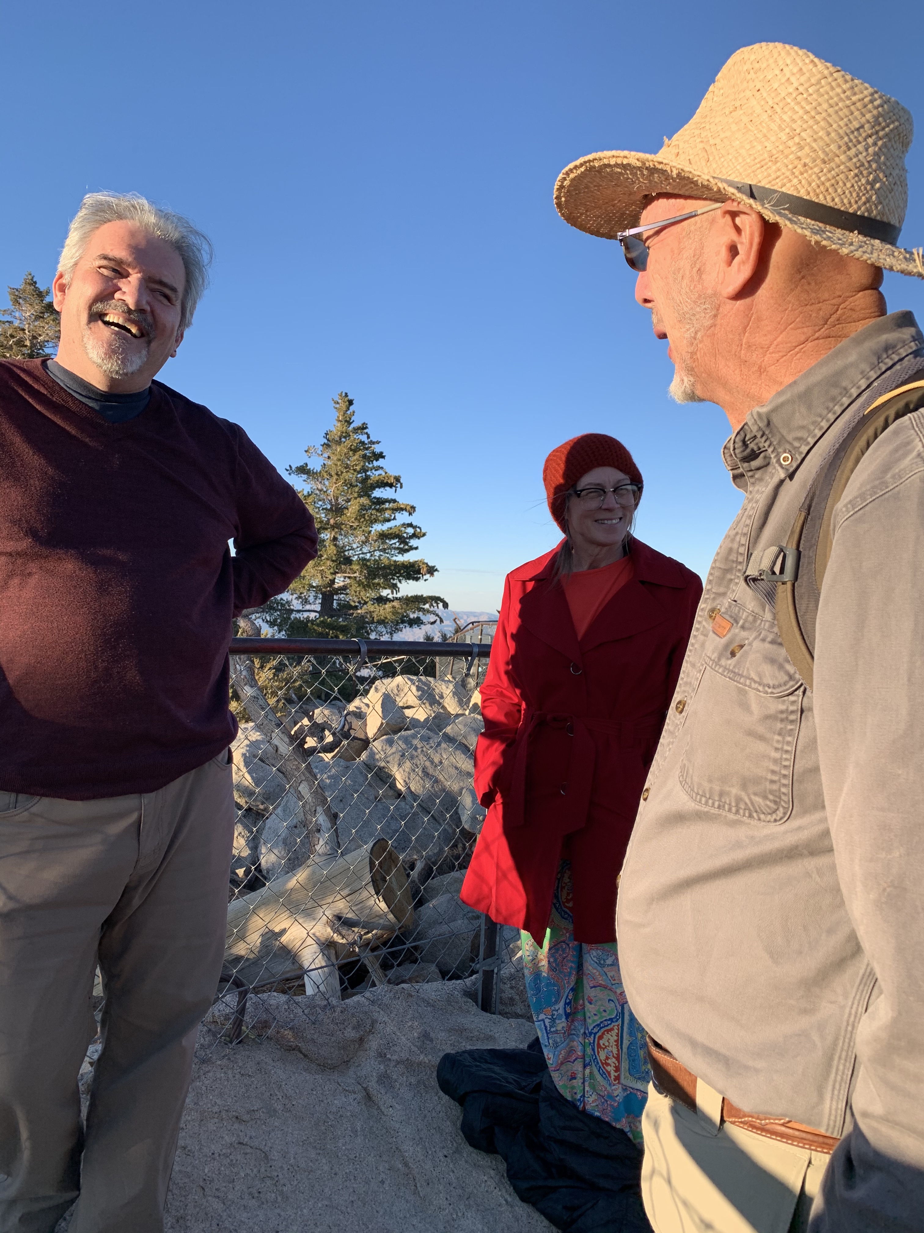 Roger had to jump out for this photo op next to this beautiful specimen. He repeatedly informs us that the Joshua Tree is not really a tree, but in the Lily family. Okay! Our highlight in Palm Springs was taking the Tram up to Grubbs View Point. The tram was huge(80 person capacity) and had a slowly spinning floor. Burr it was cold up high!We had all read the book, MOUNTAIN STORY by Lori Lansens about lost hikers above Palm Springs. As we looked out over the rough terrain we imagined what it was like to see the lights of the city below but be unable to find a way to get there.š³