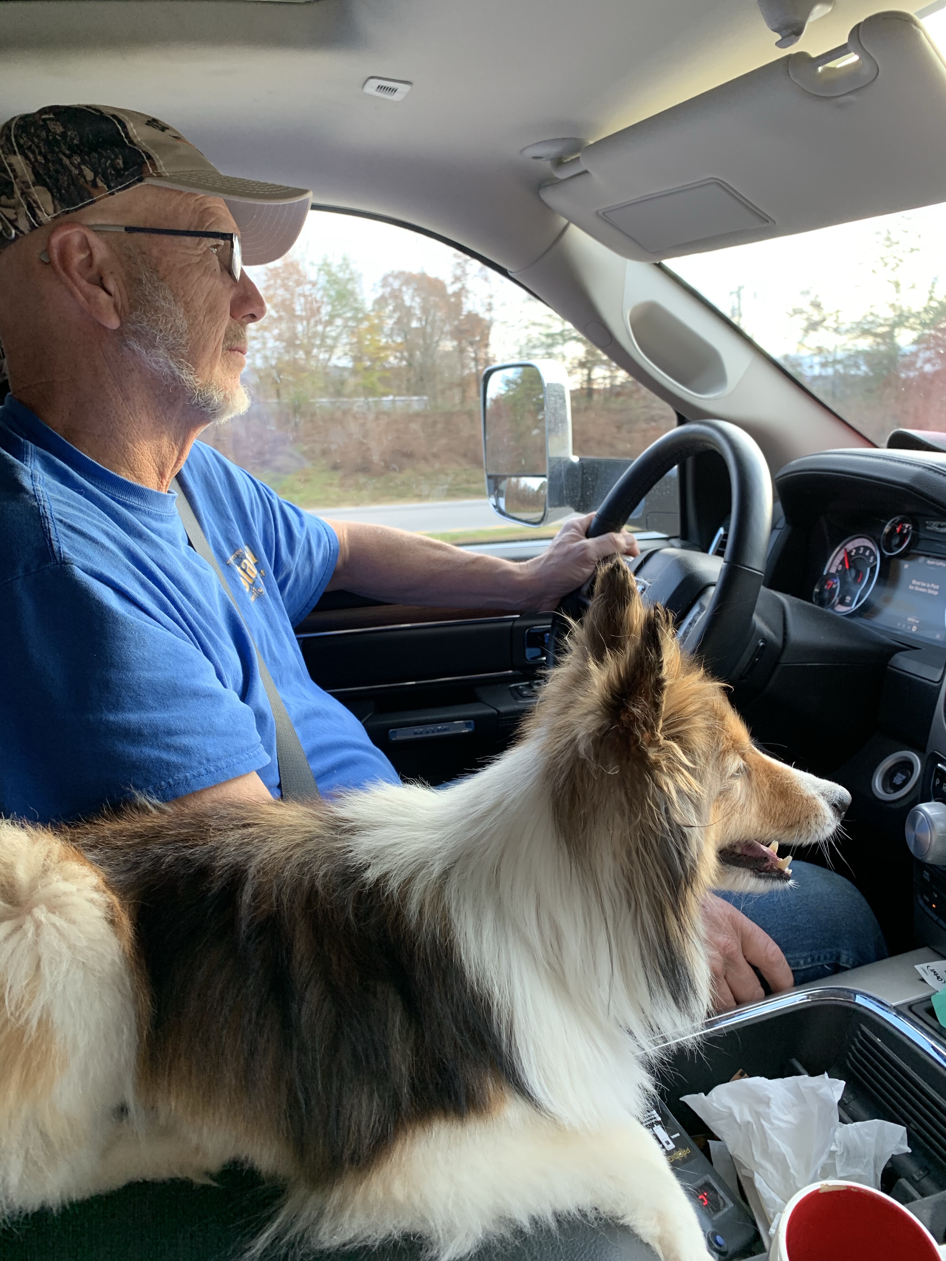 After a few weeks with a houseful of our wonderful grandchildren to play with Sunny is back on the road with us. He and Roger are concentrating on the road ahead! Thank goodness for this copilot.