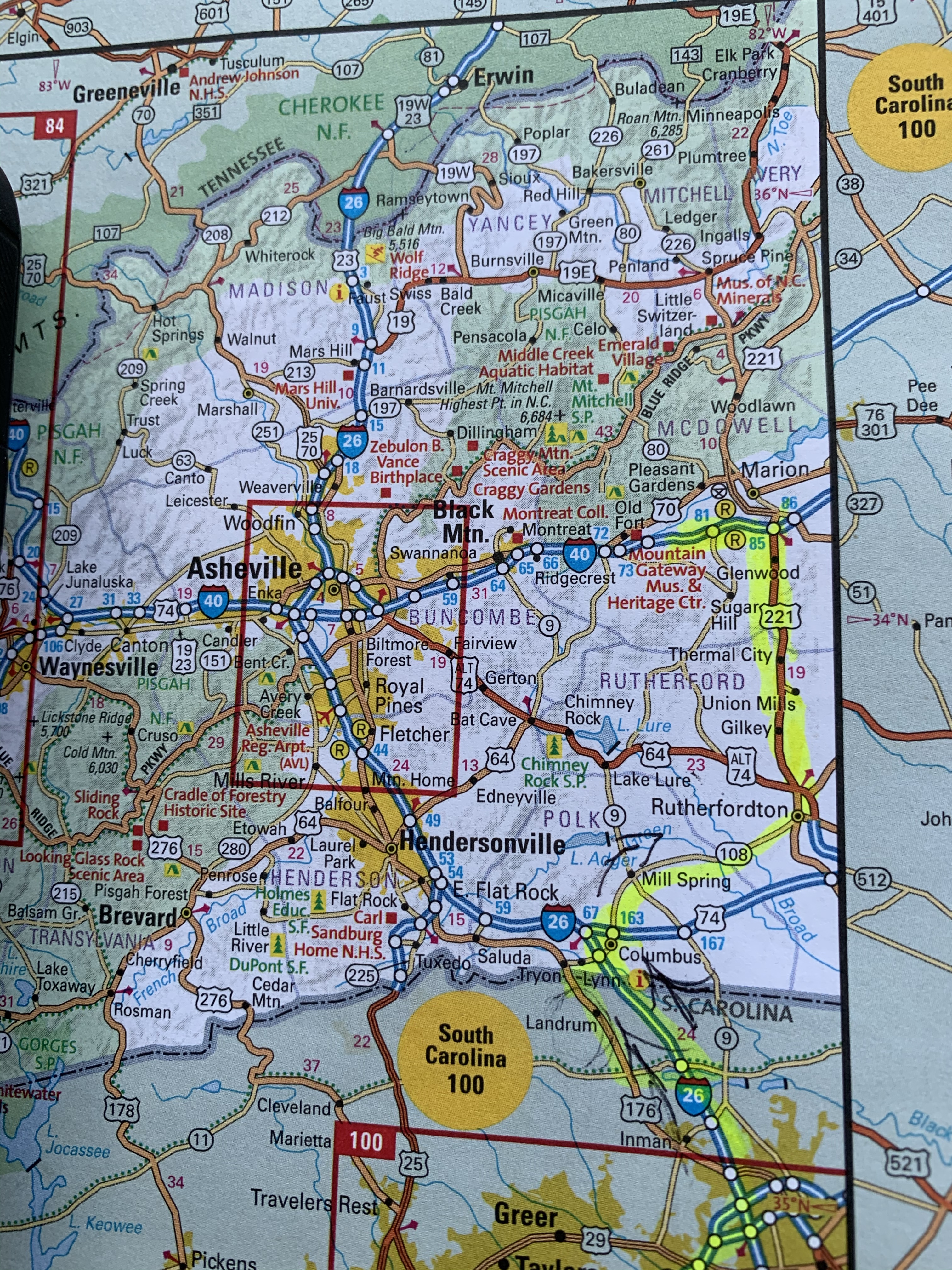 Getting better at using the atlas. Using a magnifying glass has helped my old eyes immensely! Yellow is the road traveled on.