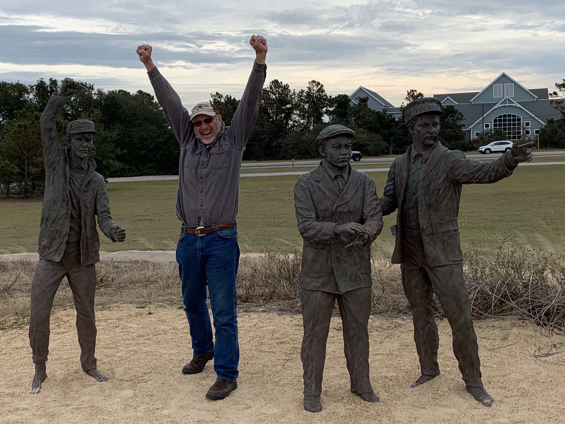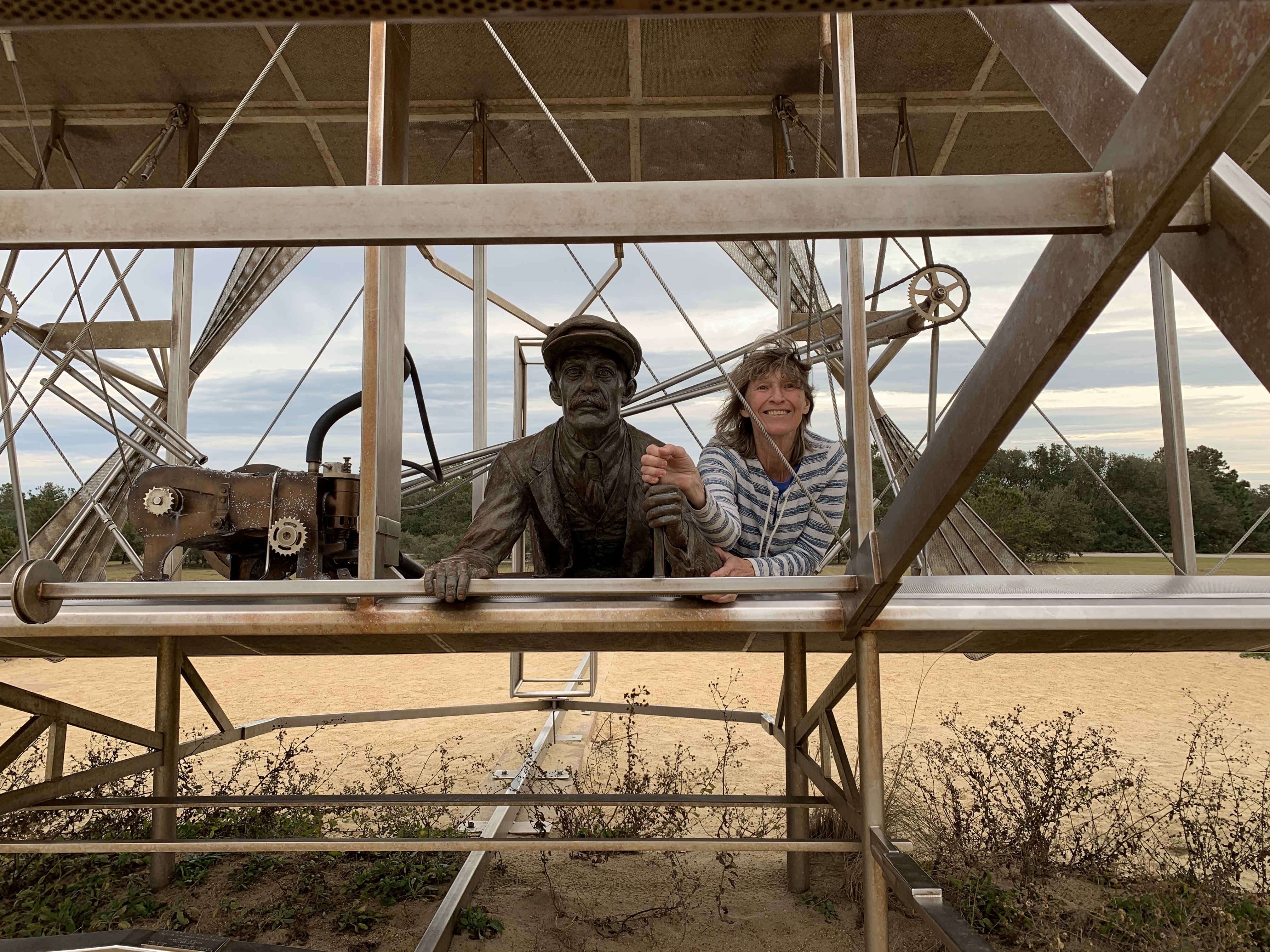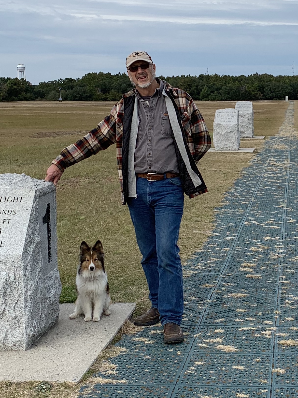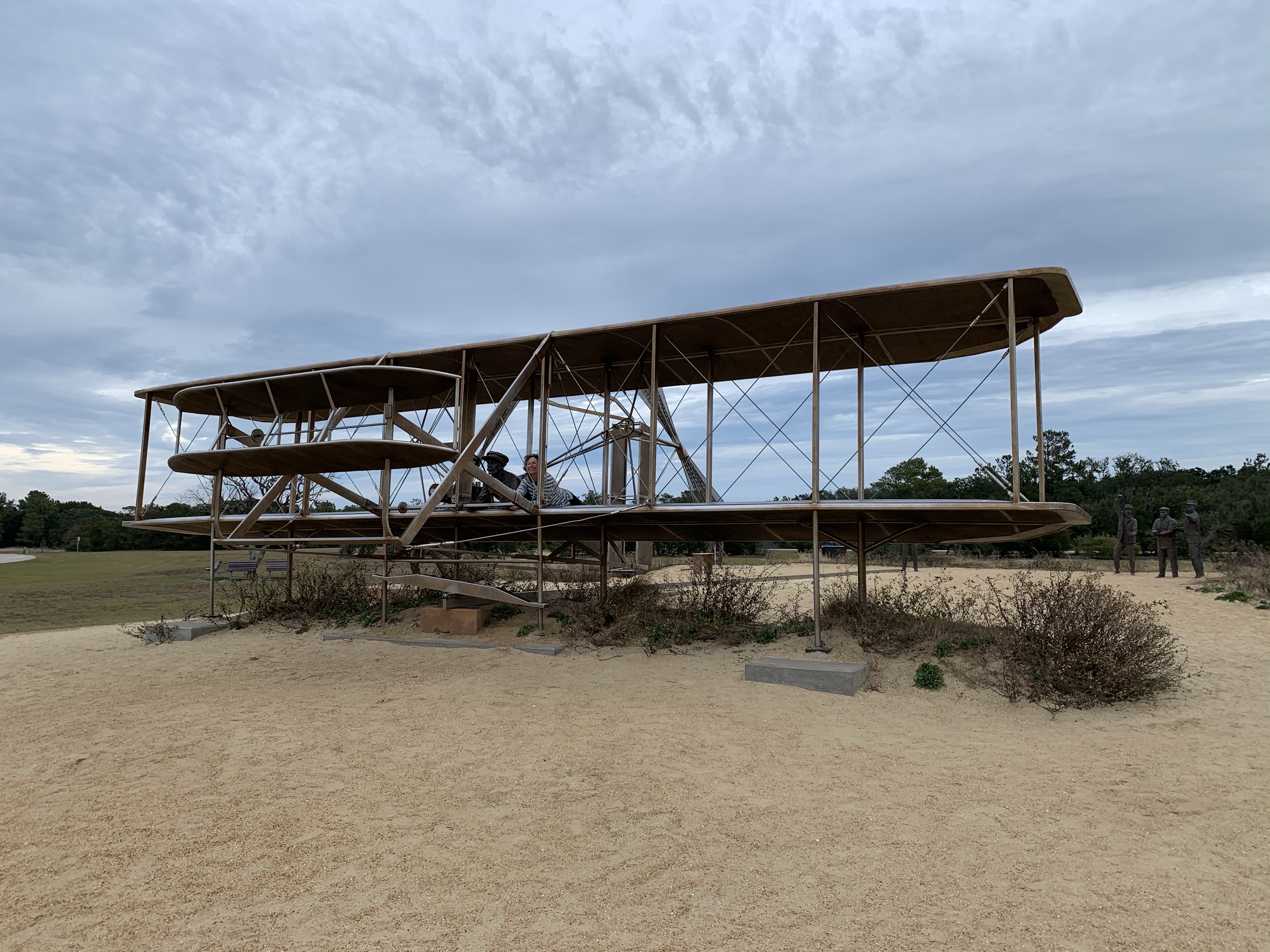 We were told some trivia about this amazing photo. The brothers asked a local resident, John T Daniels, to take pictures the day of their first successful flight. Mr. Daniels had never used a camera before that day. They told him to get ready, look through the lens, and squeeze the bulb when the plane was in the air. After the excitement, Wilbur asked him if he was able to capture Orvilleās moment. Mr. Daniels told them that he did not know if he had squeezed at the right time. The brothers had to travel back home before they could have the film developed. What a wonderful surprise it was for them to see this, now iconic, picture that had captured this historic event!Sundance sits on the spot Orvilleās first powered flight of 120ā had landed.The spot where the first four powered airplane flights took off.Sunny standing guard where the Wright Brotherās many gliding flights took off!The hill where the Wright brothers started out their quest for flight first using gliders.Jeanie and Orville lifting off!