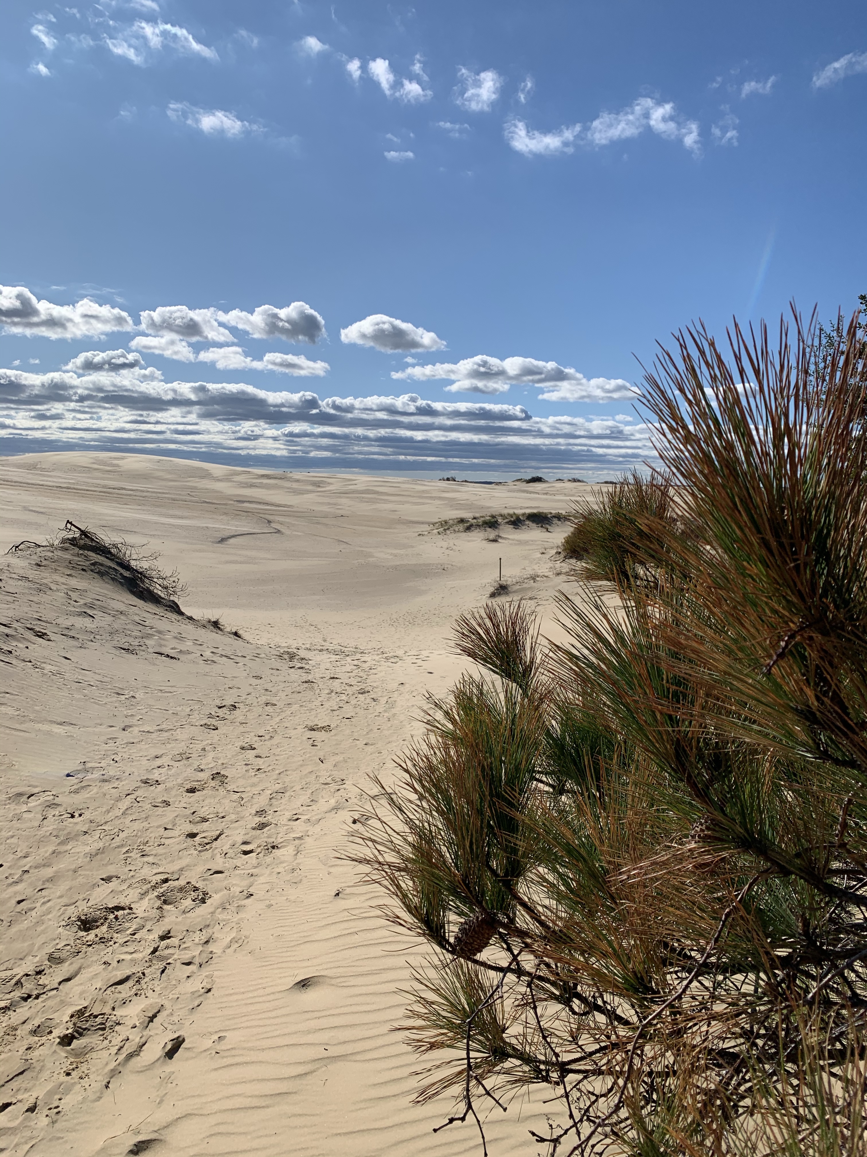 We loved the amazing over 400 acres of sand dunes here at Jockey Ridge State Park! We hiked through a little forest area and on to the dunes. It felt like we were entering another world! Roger said that we had just stepped into the Sahara Desert! The wind and sand were blowing and the clouds in the sky were gorgeous!